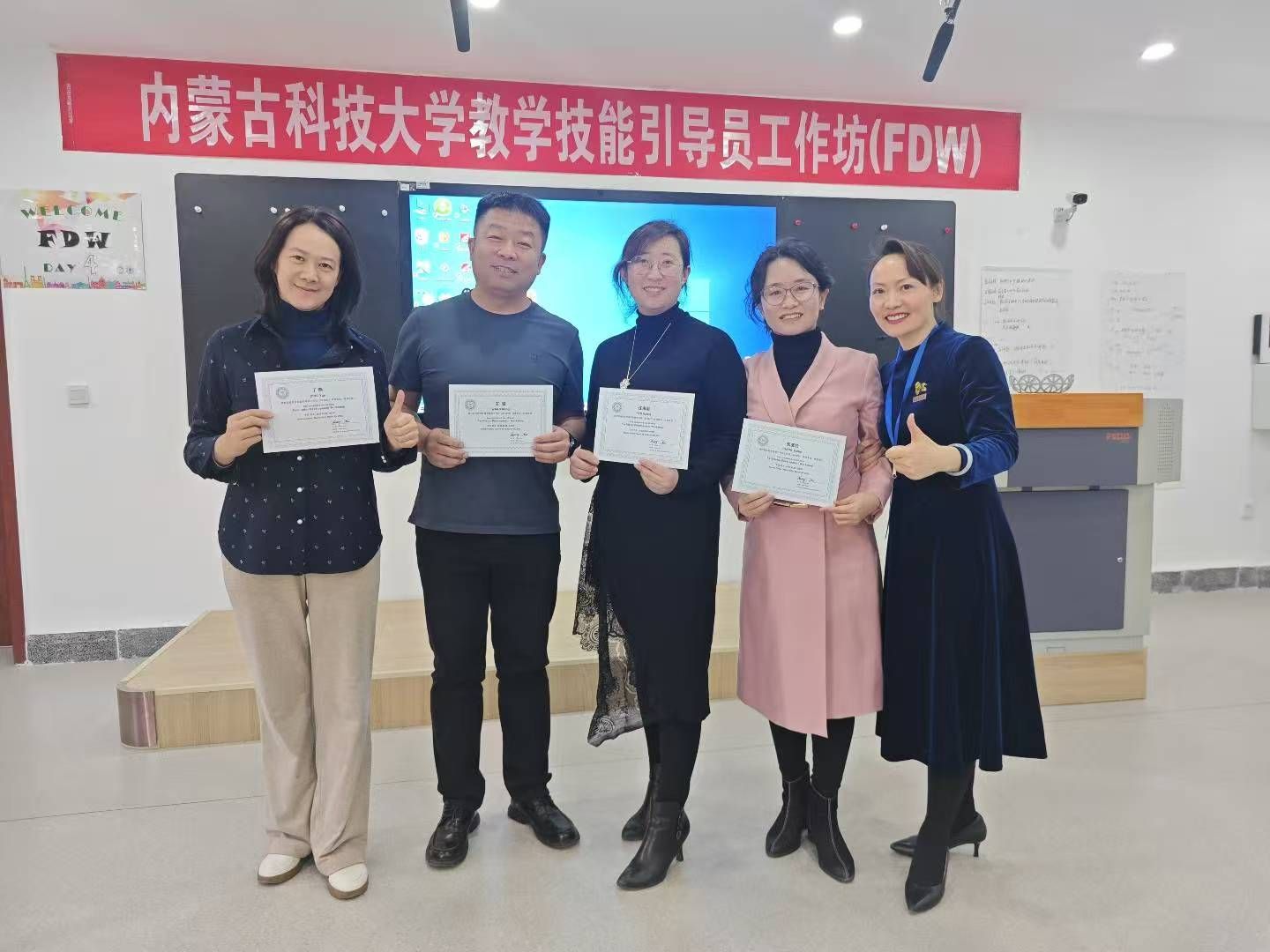 2025年12月14日,内蒙古科技大学第二期国际认证教学技能引导员研修班(FDW)顺利完成全部培训课程,圆满落下帷幕。经过四天密集研习,四名参训教师全部通过考核,获得国际认证的引导员资质证书。培训沿袭FDW特色的小班化教学模式,由北京交通大学资深培训师黄辉教授带领学员通过角色转换、实战演练和深度反思等多种形式,全面提升教学引导能力。